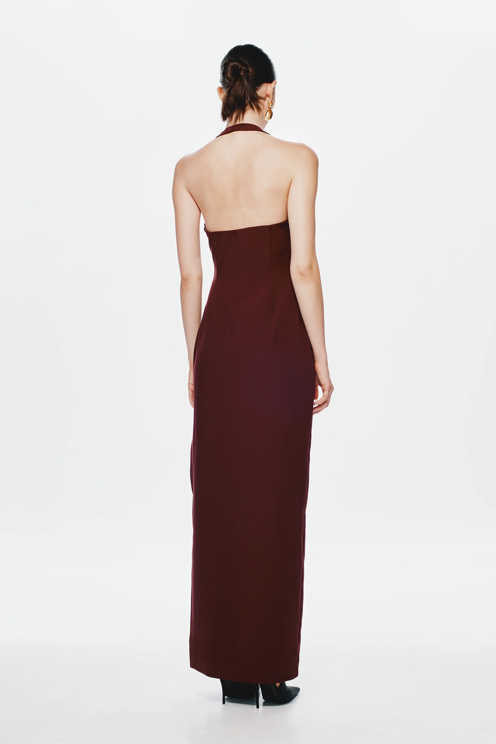 The 'Alusia' Stretch Twill Maxi Dress in Port, minimalistic in design.